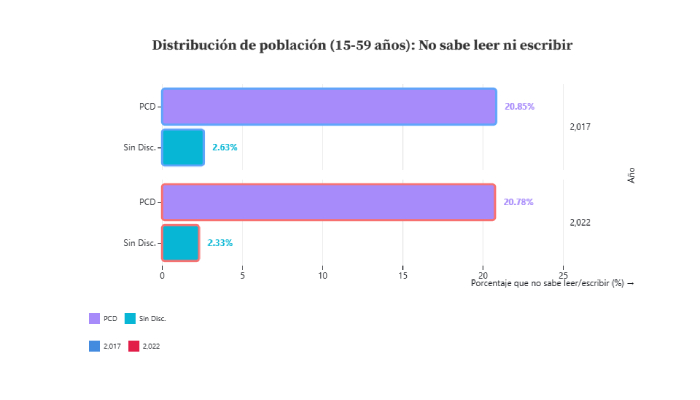 En el estrato socioeconómico las brechas son claras: entre las PCD aumentó la proporción en niveles bajo y medio bajo (73% en 2022) y se redujo la presencia en niveles alto y medio-alto, por debajo de la población general. Estos patrones (envejecimiento, mayor ruralidad y menor holgura económica) refuerzan la urgencia de más políticas de inclusión educativa, laboral y social .