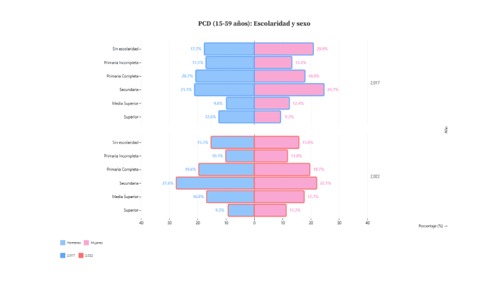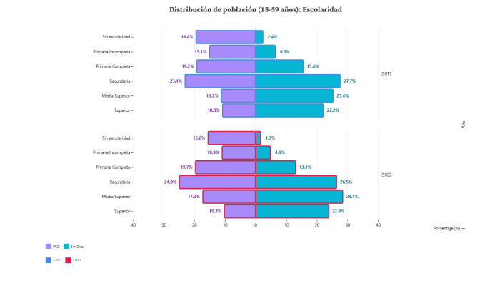 Por otro lado, en el ámbito de la escolaridad, el salto a la universidad sigue siendo la colina más empinada . En educación superior, el total de PCD se estanca, pasó de 10.8% a 10.3%, en 2022 , mientras que la población sin discapacidad pasó de 23.9% a 22.2% de 15-59 años.
