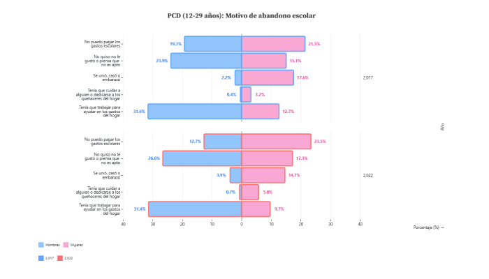 Entre mujeres con discapacidad, dejar la escuela por embarazo/pareja cayó (de 17.6% a 14.7%) , mientras no poder pagar subió un poco (de 21.5% a 23.5%) . En hombres con discapacidad, salirse para trabajar se mantuvo (31%) y no poder pagar bajó de 19.3% a 12.7%. Las barreras cambian de rostro: menos normas de género, más economía.