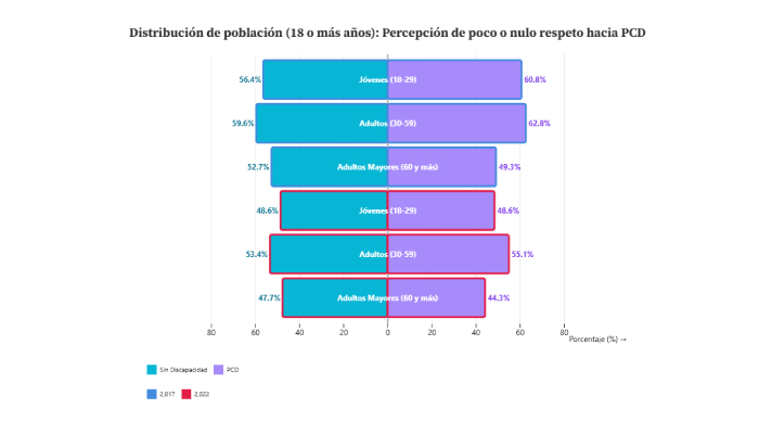 Menos adultos mayores piensan que a quienes tienen una discapacidad no se les respetan sus derechos . Entre 2017 y 2022 cae la proporción que percibe "poco o nulo respeto" a los derechos de las PCD por arriba de 5 puntos porcentuales, donde distinguimos lo que opinan las personas sin discapacidad y con discapacidad: Personas sin discapacidad: jóvenes de 56.4% a 48.6% y PCD: jóvenes de 60.8% a 48.6%, Personas sin discapacidad: adultos de 59.6% a 53.4% y PCD: adultos de 62.8% a 55.1%**, Personas sin discapacidad: mayores de 52.7% a 47.7% y PCD: mayores de 49.3% a 44.3%. Esto sugiere un cambio positivo en las actitudes declaradas hacia las personas con discapacidad , sobre todo según la opinión de otras personas con discapacidad, aunque la mitad de la población aún percibe irrespeto , lo cual muestra que el avance es real, pero incompleto .