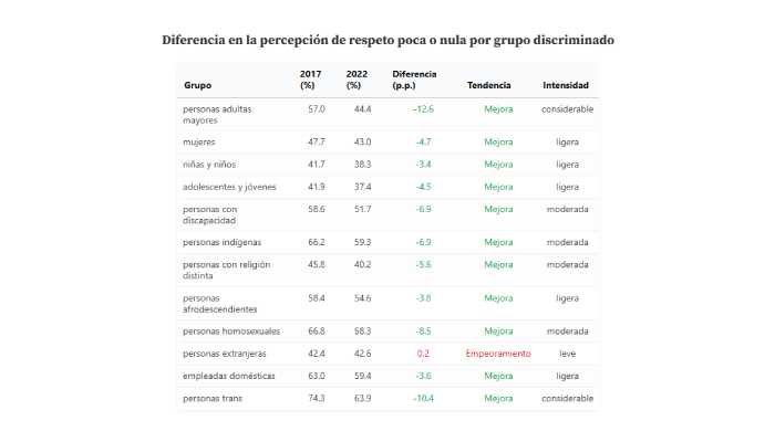 Así, la percepción social hacia las personas con discapacidad muestra una de las mejoras más claras dentro de todos los grupos evaluados por ENADIS. La proporción de quienes consideran que hay "poco o nulo respeto" a sus derechos bajó siete puntos porcentuales (de 58.6% a 51.7%), un cambio que solo superan las caídas observadas en los grupos trans y adultos mayores.