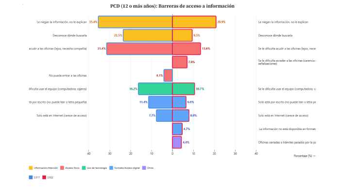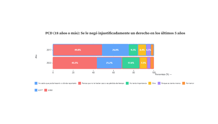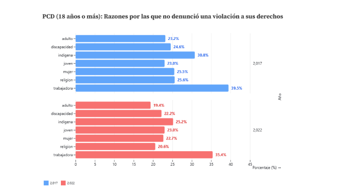 Entre 2017 y 2022, la proporción de PCD de 18 años y más que dijo haber sido discriminada en los últimos 12 meses subió de 19% a 23.9% , un aumento de 4.9 puntos porcentuales. En 2022, ese nivel coloca a la PCD entre los grupos con tasas más altas, junto con mujeres (24.2% y población indígena (26.7%). El repunte puede reflejar mayor disposición a denunciar y mayor conciencia social, pero también la persistencia de prácticas discriminatorias que siguen presentes en varios ámbitos de la vida cotidiana.