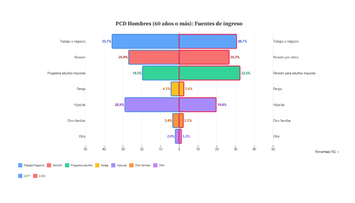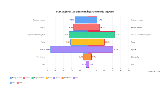 En hogares con PCD mayores, la pensión para adultos ya es la principal fuente de ingreso para ambos sexos (33%), mientras que el trabajo/negocio pesa mucho más en hombres (30.7%) que en mujeres (11.3%). En 2017, ellas dependían con mucha mayor frecuencia de hijas/os (45.8%); esa carga familiar sigue alta (30.8%) pero bajó. Para política pública, este apoyo podría empezar mitigar pobreza en la vejez y a ser una ayuda que pudiera descomprimir a las familias.