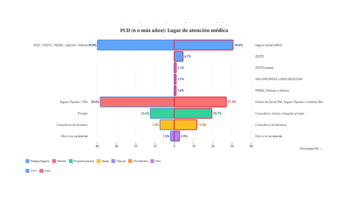 Entre la población con discapacidad el uso de servicios institucionales (IMSS/ISSSTE/PEMEX/Defensa/Marina) bajó ligeramente (de 39.8% a 38.5% sumando las categorías nuevas de 2022), y la atención en SSA/Seguro Popular/INSABI/IMSS-Bienestar pasó de 38.4% a 27.1% una caída fuerte , pensando que es una población que requiere una mayor y más diversa atención médica. En paralelo, creció la atención privada (de 12.4% a 19.7%) y la confianza en los consultorios de farmacia (de 7.4% a 11.8%) . Esto representa un cambio de rutas que exige vigilancia en cuanto a la calidad de los servicios públicos y el gasto en los bolsillo de las personas con discapacidad y sus familiares.