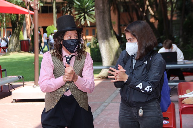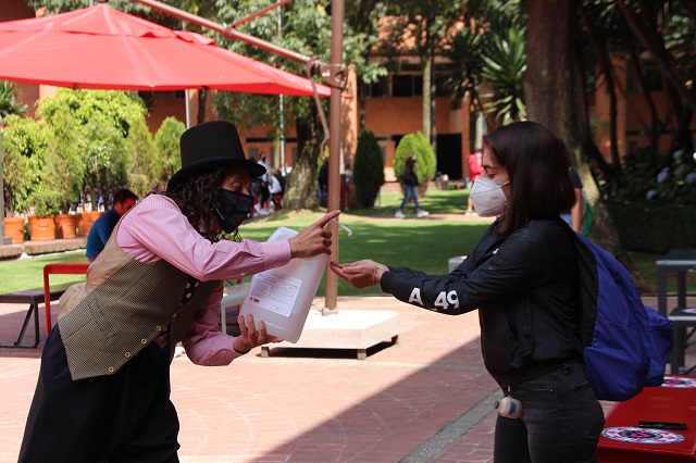 Un trío de artistas repartió cubrebocas entre la Comunidad IBERO, en particular el alumnado, como parte de la campaña para promover el autocuidado en la población estudiantil durante el regreso escalonado a las clases presenciales en la Universidad Iberoamericana Ciudad de México.