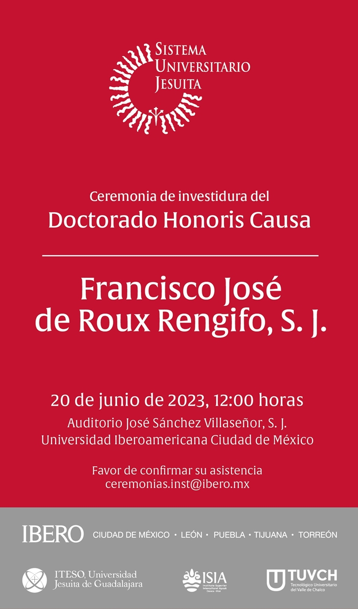 La investidura del Padre Francisco de Roux S. J. tendrá lugar en la IBERO Ciudad de México el 20 de junio a las 12:00 horas, en el marco del primer aniversario del asesinato de nuestros hermanos jesuitas Javier Campos S. J. y Joaquín Mora S. J. en el templo de Cerocahui, en la Sierra Tarahumara de Chihuahua.