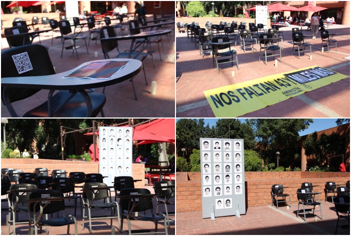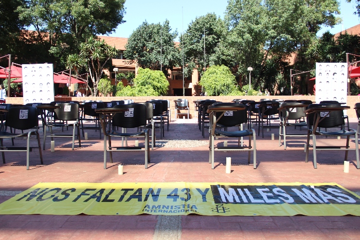 Además del pase de lista, en la explanada central de la Ibero CDMX se colocaron sillas vacías con los nombres de los 43 normalistas desaparecidos de Ayotzinapa.