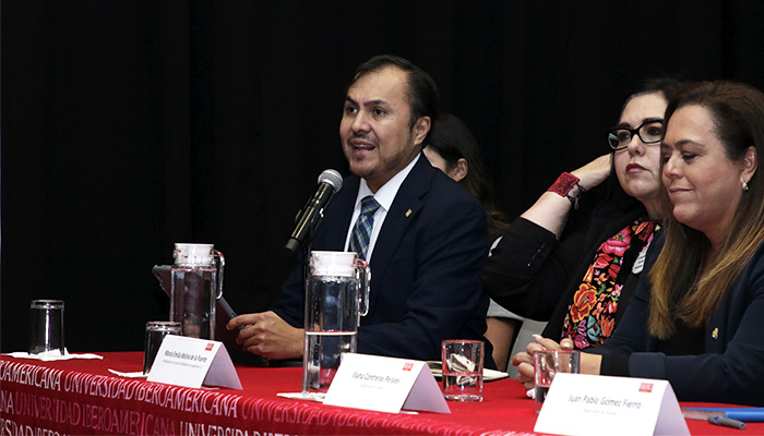 En el conversatorio participaron las Magistradas de Circuito María Emilia Molina de la Puente e Iliana Contreras Perales; el Magistrado Juan Pablo Gómez Fierro; Claudia Aguilar Barroso, Socia Directora y fundadora de Aguilar Barroso Abogados, y Arturo Pueblita Fernández, profesor de la IBERO y presidente del Ilustre y Nacional Colegio de Abogados.